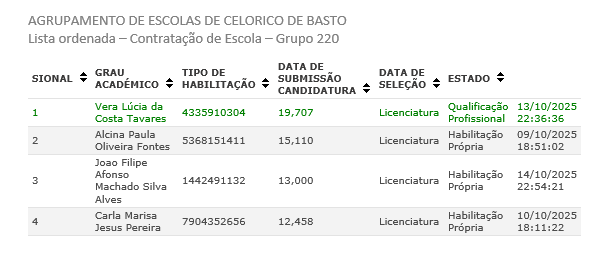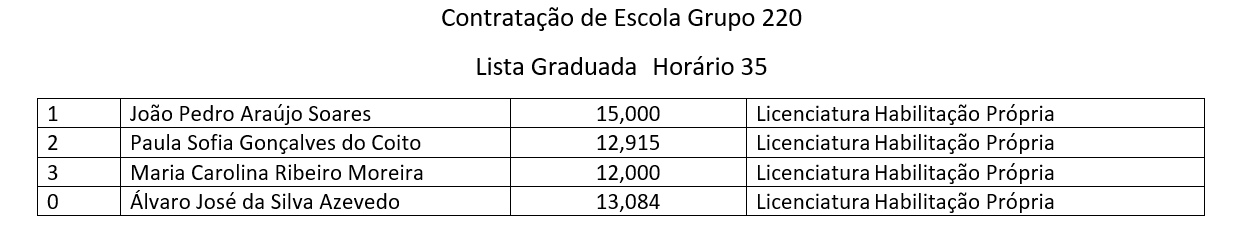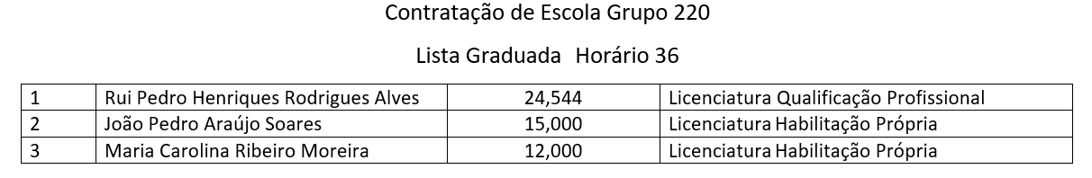Lista de ordenação final dos candidatos ao horário n.º 52 (Grupo 220)